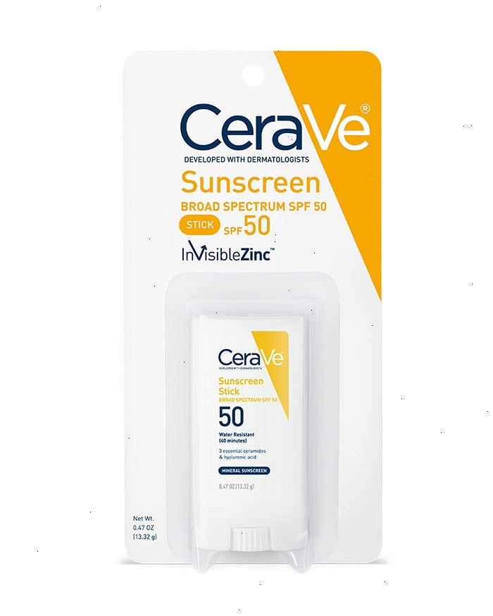 CeraVe Sunscreen Stick with broad-spectrum SPF 50 features zinc oxide and titanium dioxide UVA and UVB filters in a fragrance-free, oil-free and convenient sun care formula. It's perfect for use anytime and anywhere and is suitable for all skin types, including sensitive skin. Formulated with three essential ceramides that help restore the skin’s natural barrier, our SPF 50 sunscreen stick is water-resistant for up to 40 minutes, and the microfine zinc oxide gives you powerful sun protection that spreads easily and evenly, while also leaving a clear finish.